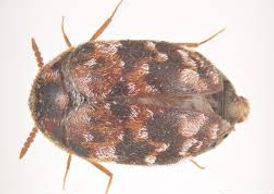 La mayoría de los escarabajos de alfombra pueden volar sin embargo, la mayoría de las infestaciones que ocurren a través de alimentos contaminados. Su longitud va de 2 a 5 mm Las larvas se alimentan de una gran variedad de subproductos animales y vegetales como: alimentos secos para mascotas, especímenes de museo, cueros, pescado seco, plumas, fieltro, pelusas o pelos en los retornos de los conductos de aire, los insectos muertos, cadáveres secos, semillas, granos, cereales, alfombras, ropa de lana, seda, terciopelo, pieles, especias, harina de maíz, alimento de pescado, papas fritas y muchos otros demasiado numerosos para mencionar.